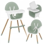 Tinka nuo 6 mėn. iki 25 kg. Šiuolaikinio dizaino maitinimo kėdutė 2in1 su apsauga nuo vaiko nuslydimo. Funkcija 2in1: kėdutė prie suaugusiųjų stalo ir žema kėdutė prie žaidimų stalelio. 5 taškų saugos diržai, 2 reguliuojamos kėdutės aukščio pozicijos, reguliuojamas pakojis. Nuimamas, reguliuojamas padėklas. Išimamas, lengvai valomas dėklas. Medinės buko kojos su neslidžiu pagrindu. Kėdės užvalkalas pagamintas iš minkštos eko odos.